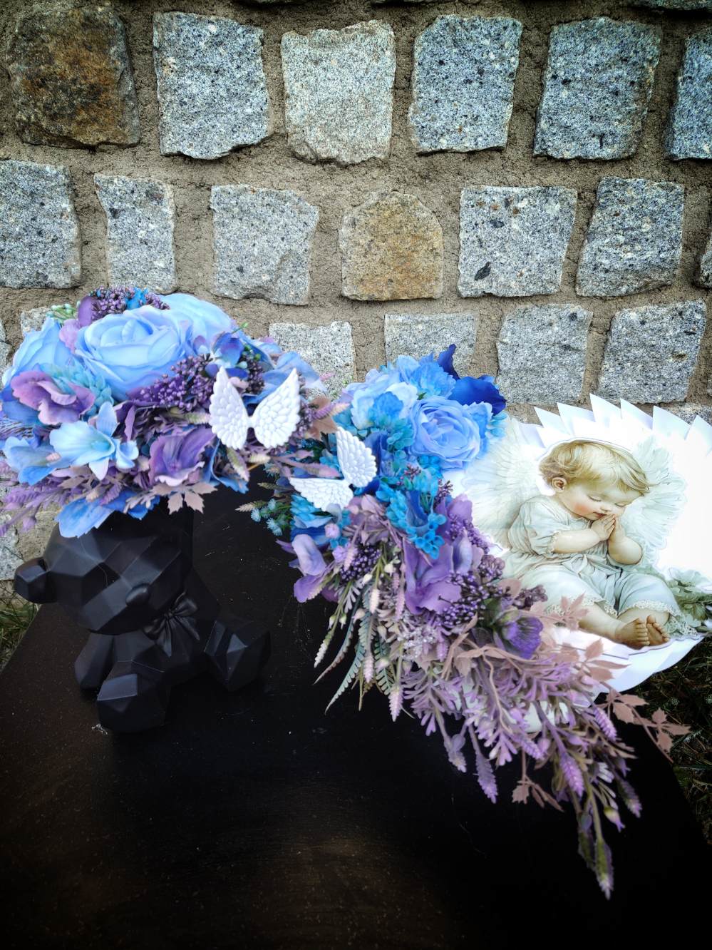 Ta elegancka dekoracja nagrobna to wyjątkowy dodatek do upamiętnienia bliskiej osoby. Wykonana z wysokiej jakości sztucznych kwiatów w odcieniach błękitu i bieli z czarnym misiem jako podstawa stroika. Ozdoba przyciąga wzrok i jest odporna na warunki atmosferyczne. Dekoracja idealnie nadaje się do ozdobienia nagrobka, dodając mu subtelnej elegancji i trwałego uroku. Wybierając nasze trwałe dekoracje nagrobne, zapewniasz pomnikowi piękno i wyraz pamięci przez długi czas. Stroik w kształcie serca nie jest w cenie, jest to przykładowe zdjęcie.