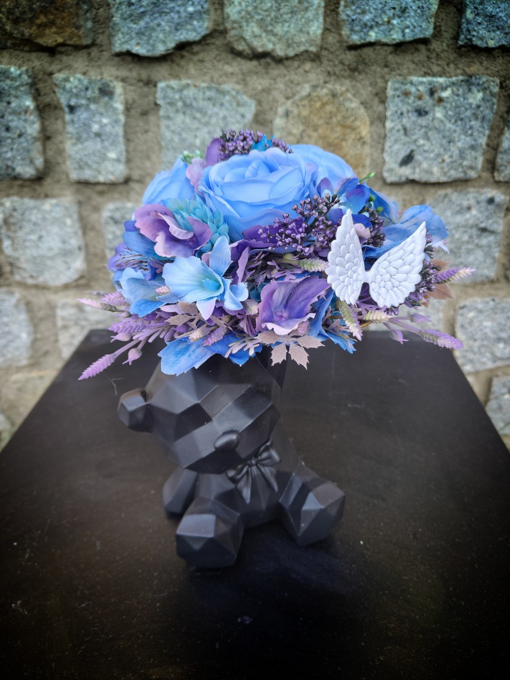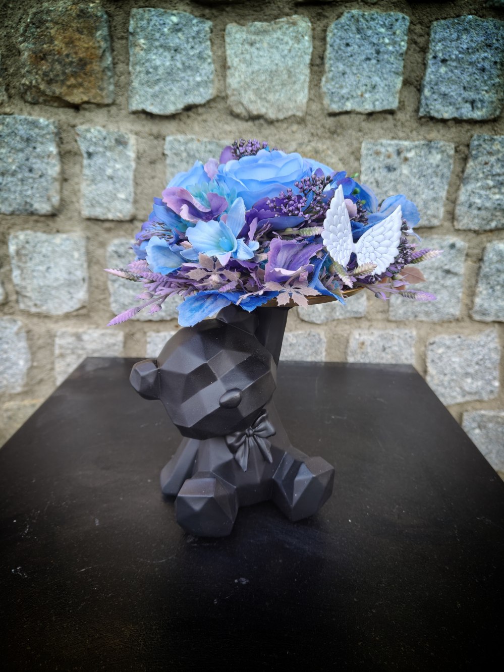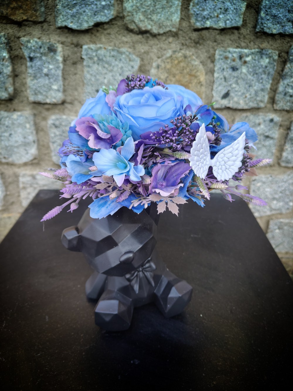 Materiał: Wysokiej jakości sztuczne kwiaty i dodatki odporne na warunki atmosferyczne, plastikowy miś.