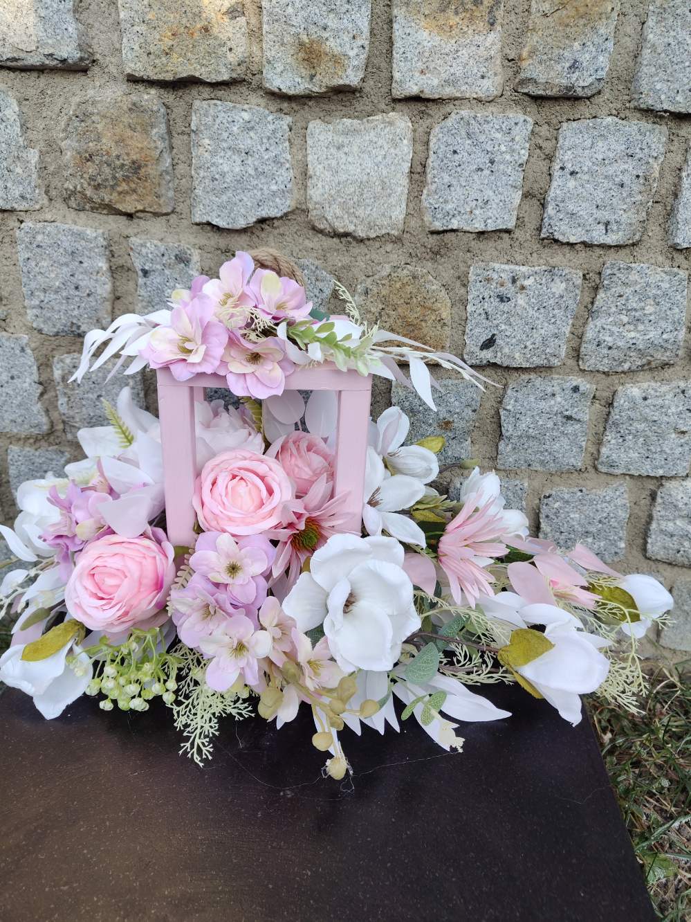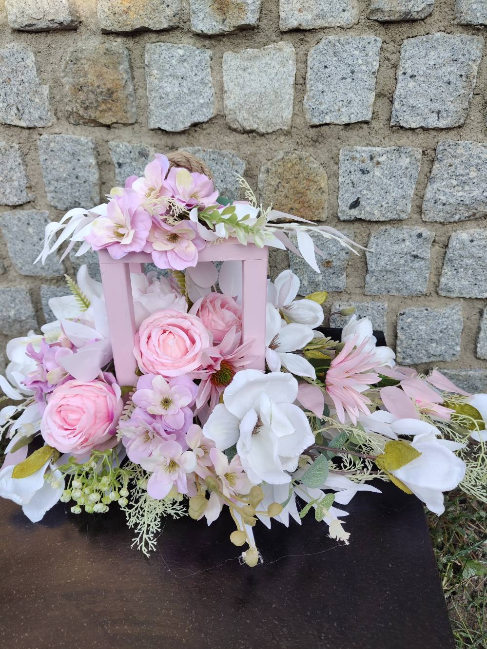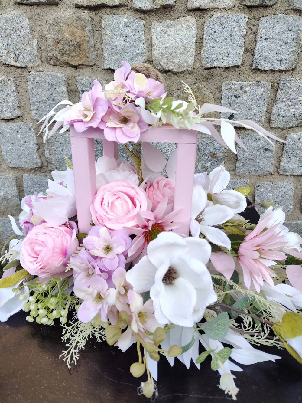 Materiał: Wysokiej jakości sztuczne kwiaty i  dodatki odporne na warunki atmosferyczne, drewniany lampion