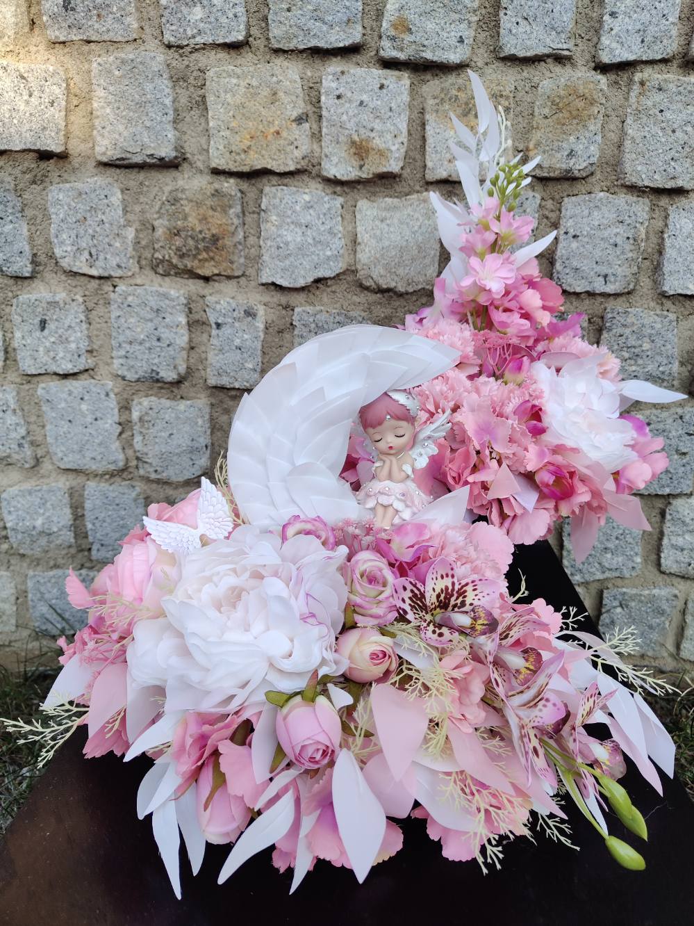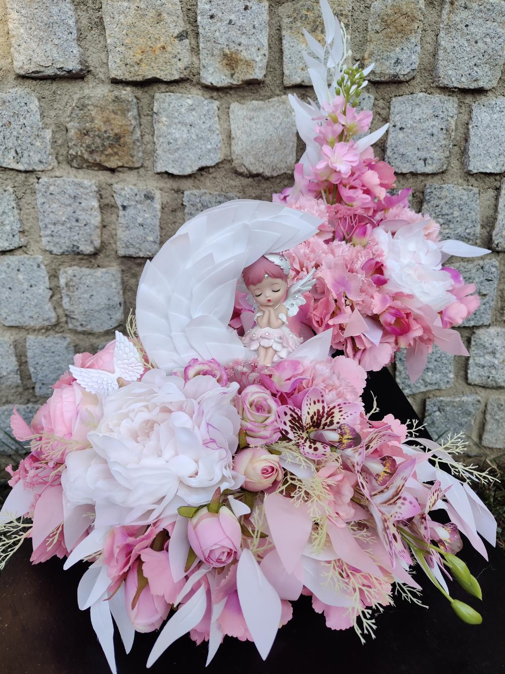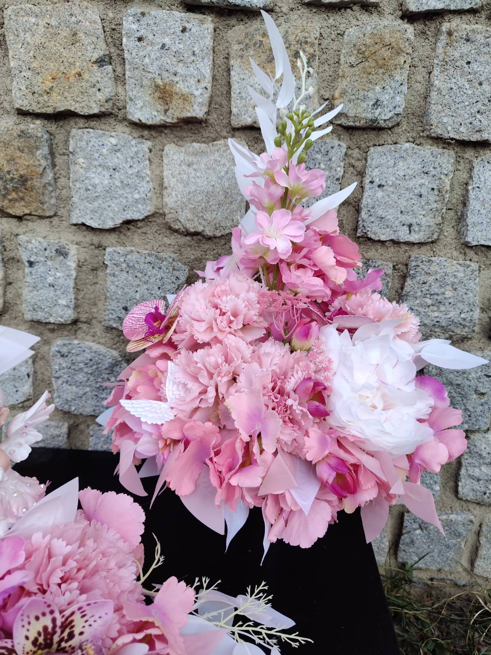Ta elegancka dekoracja nagrobna to wyjątkowy dodatek do upamiętnienia bliskiej osoby. Wykonana z wysokiej jakości sztucznych kwiatów w odcieniach różu i bieli, ozdoba przyciąga wzrok i jest odporna na warunki atmosferyczne. Dekoracja idealnie nadaje się do ozdobienia nagrobka, dodając mu subtelnej elegancji i trwałego uroku. Wybierając nasze trwałe dekoracje nagrobne, zapewniasz pomnikowi piękno i wyraz pamięci przez długi czas.
