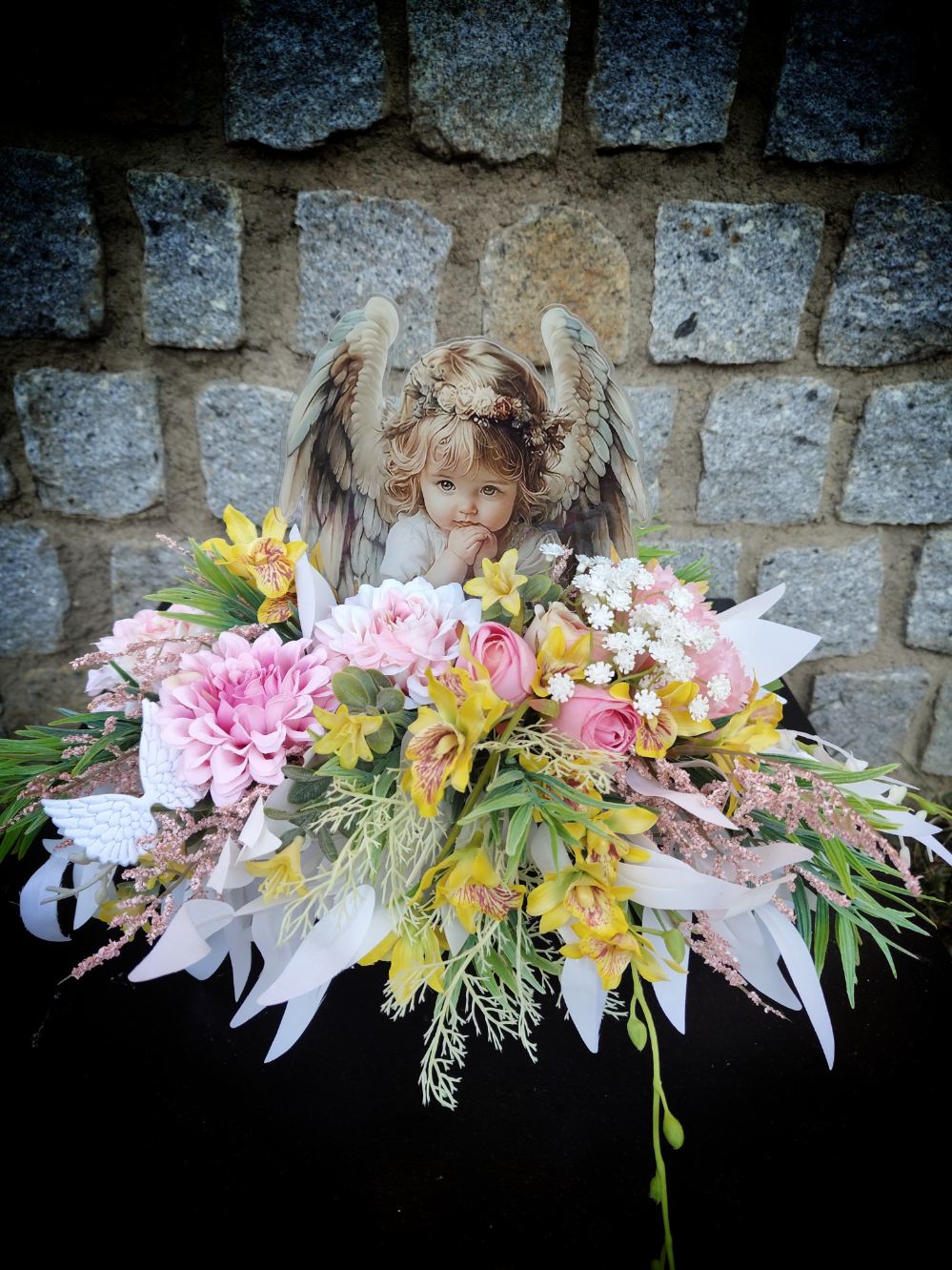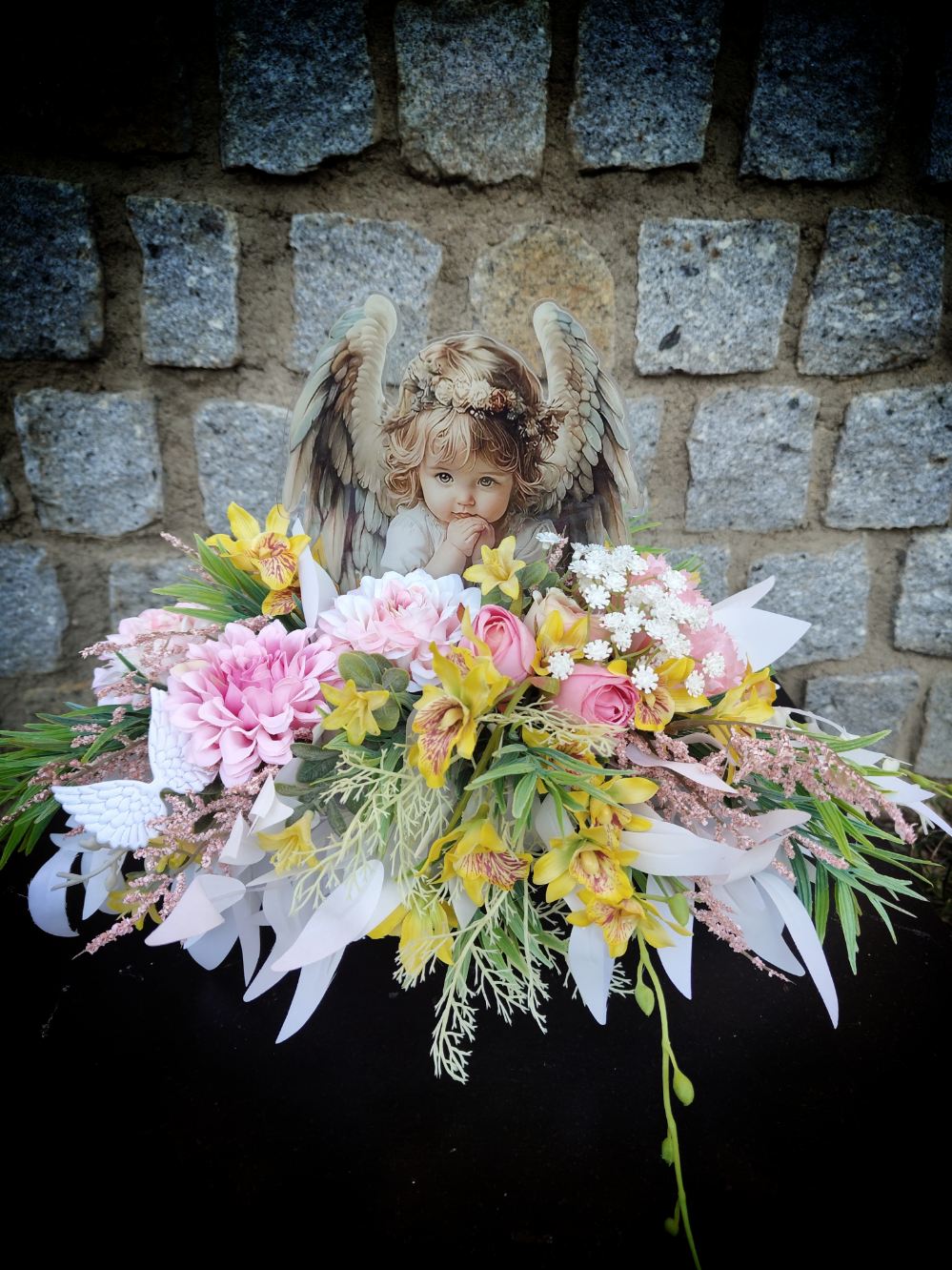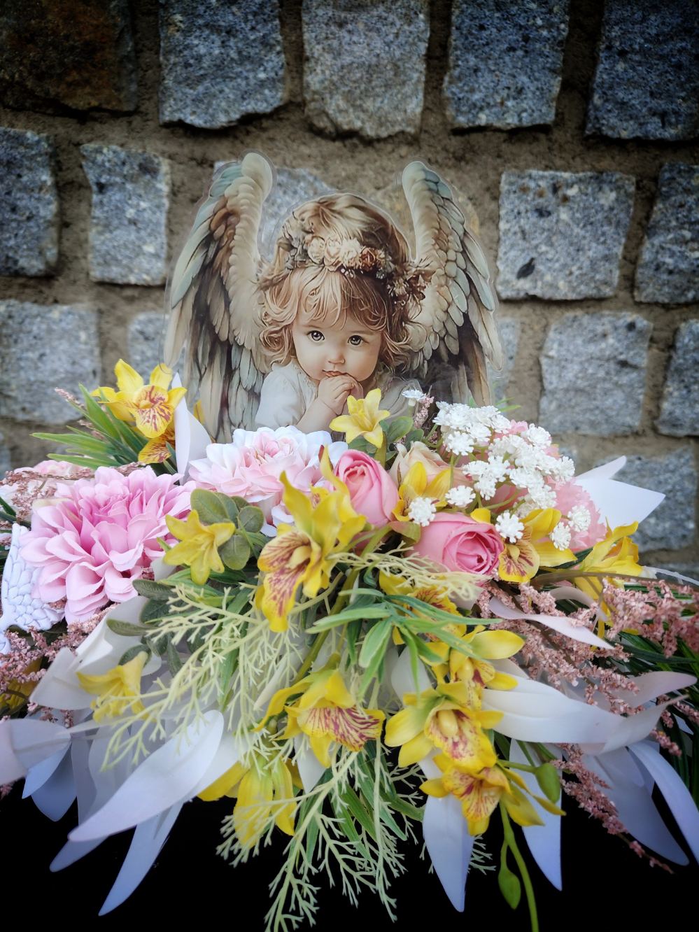 Kompozycja wykonana z wysokiej jakości sztucznych kwiatów w wiosennych barwach. Ozdoba przyciąga wzrok i jest odporna na warunki atmosferyczne. Idealnie nadaje się do ozdobienia nagrobka, dodając mu subtelnej elegancji i trwałego uroku. Wybierając nasze trwałe dekoracje nagrobne, zapewniasz pomnikowi piękno i wyraz pamięci przez długi czas.